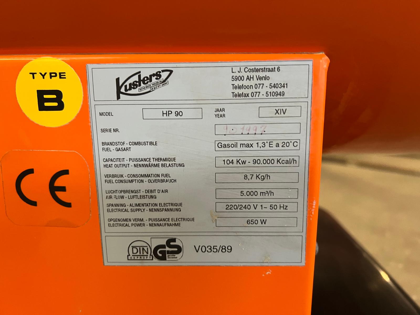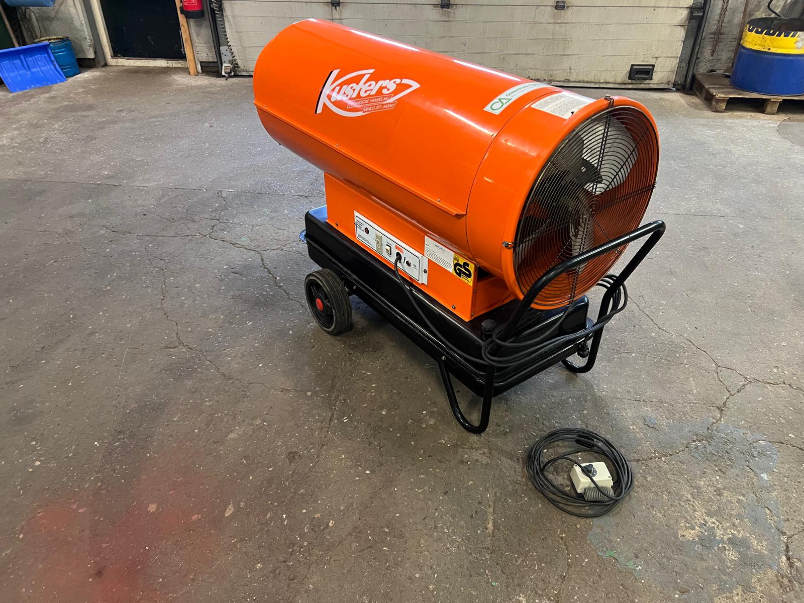 Een gebruikte Kusters HP90 heteluchtkanon in goede staat — een krachtige en betrouwbare indirecte luchtverhitter van het bekende Nederlandse merk Kusters THO, al ruim een eeuw actief in klimaatbeheersing.
